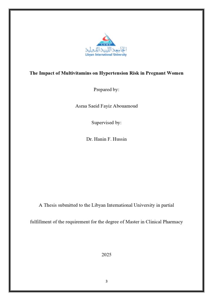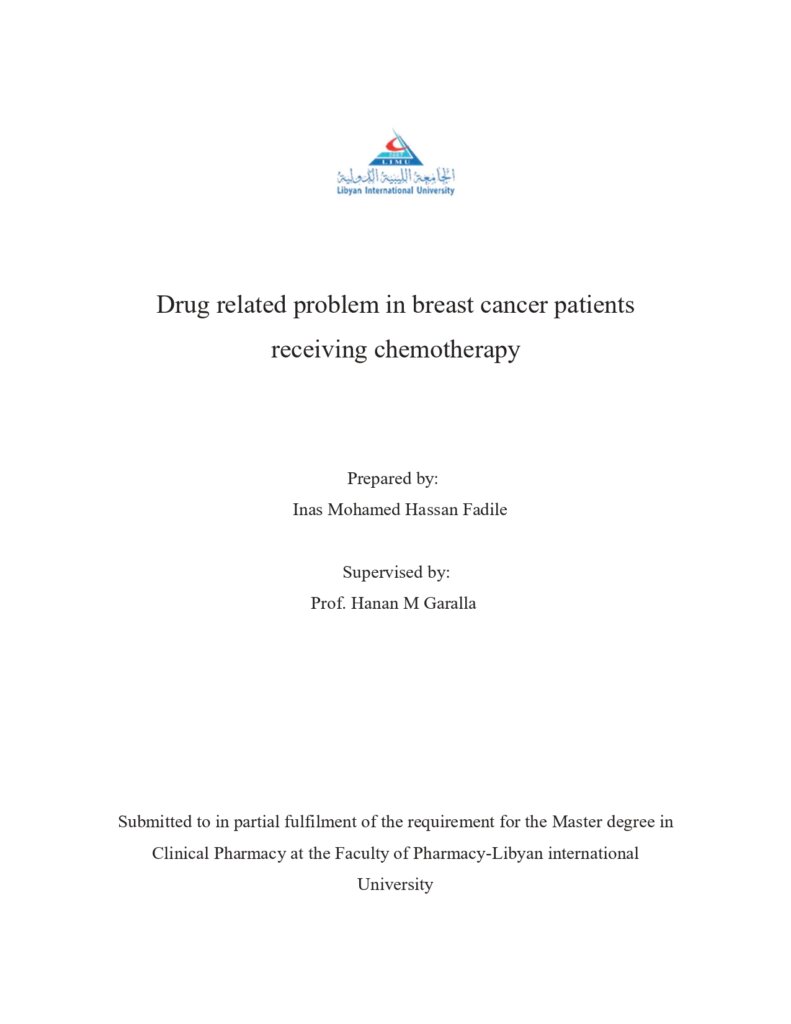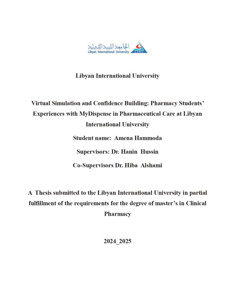 Master's theses, Clinical Pharmacy program Drug related problem in breast cancer patients receiving chemotherapy Inas Mohamed Hassan Fadile View the thesis Virtual Simulation and Confidence Building: Pharmacy Students’ Experiences with MyDispense in Pharmaceutical Care at Libyan International University Amena Hammoda View the thesis The Impact of Multivitamins on Hypertension Risk in Pregnant Women Asraa Saeid Fayiz Abouamoud View the thesis